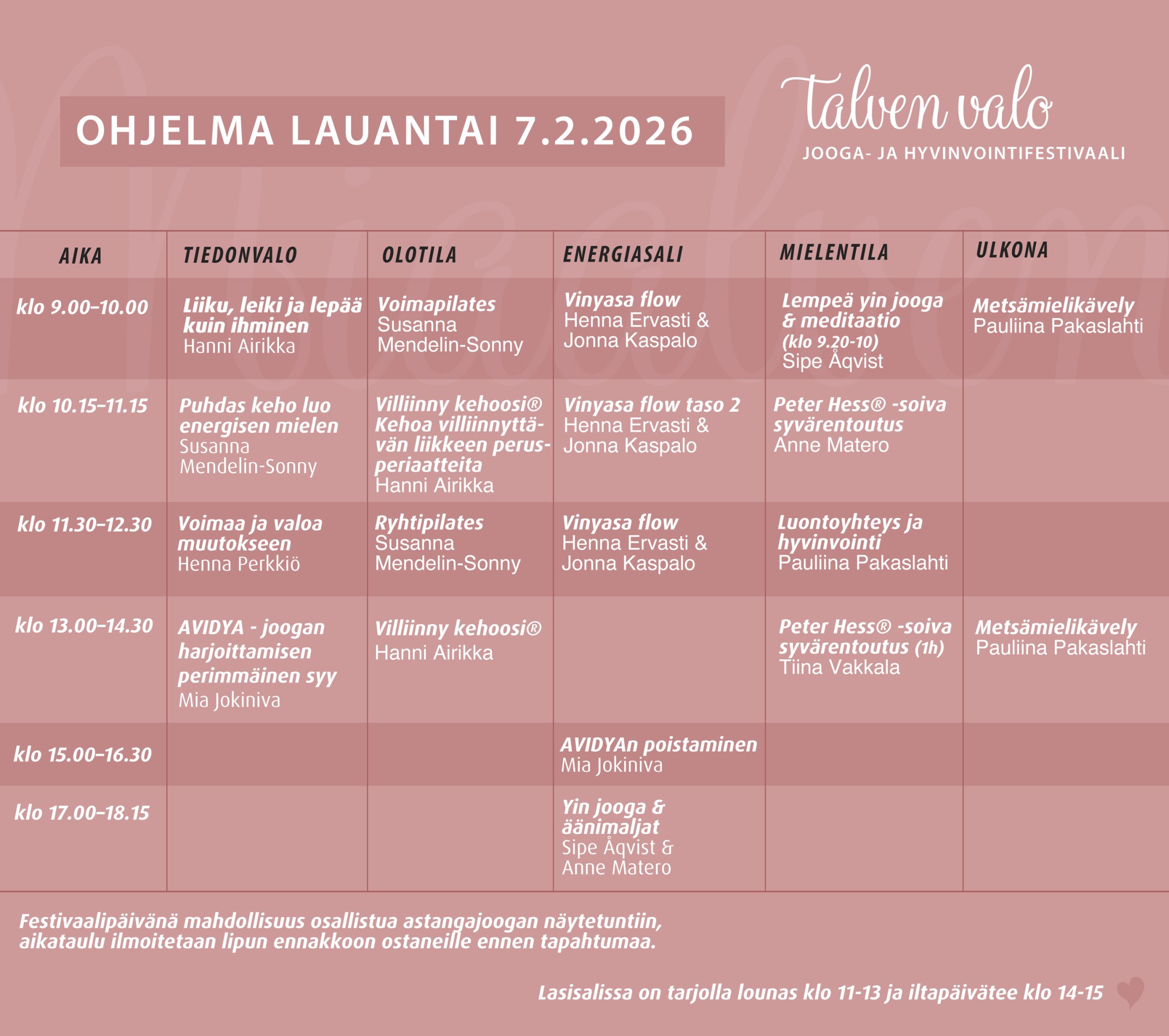 Lauantain ohjelma on täynnä hyvää virtausta, vahvistavia harjoituksia, energisiä tunteja ja inspiroivia puheenvuoroja. Päivän tavoitteena on herättää elämäniloa, kirkastaa mieltä ja avata tilaa kehon omalle voimavirralle.