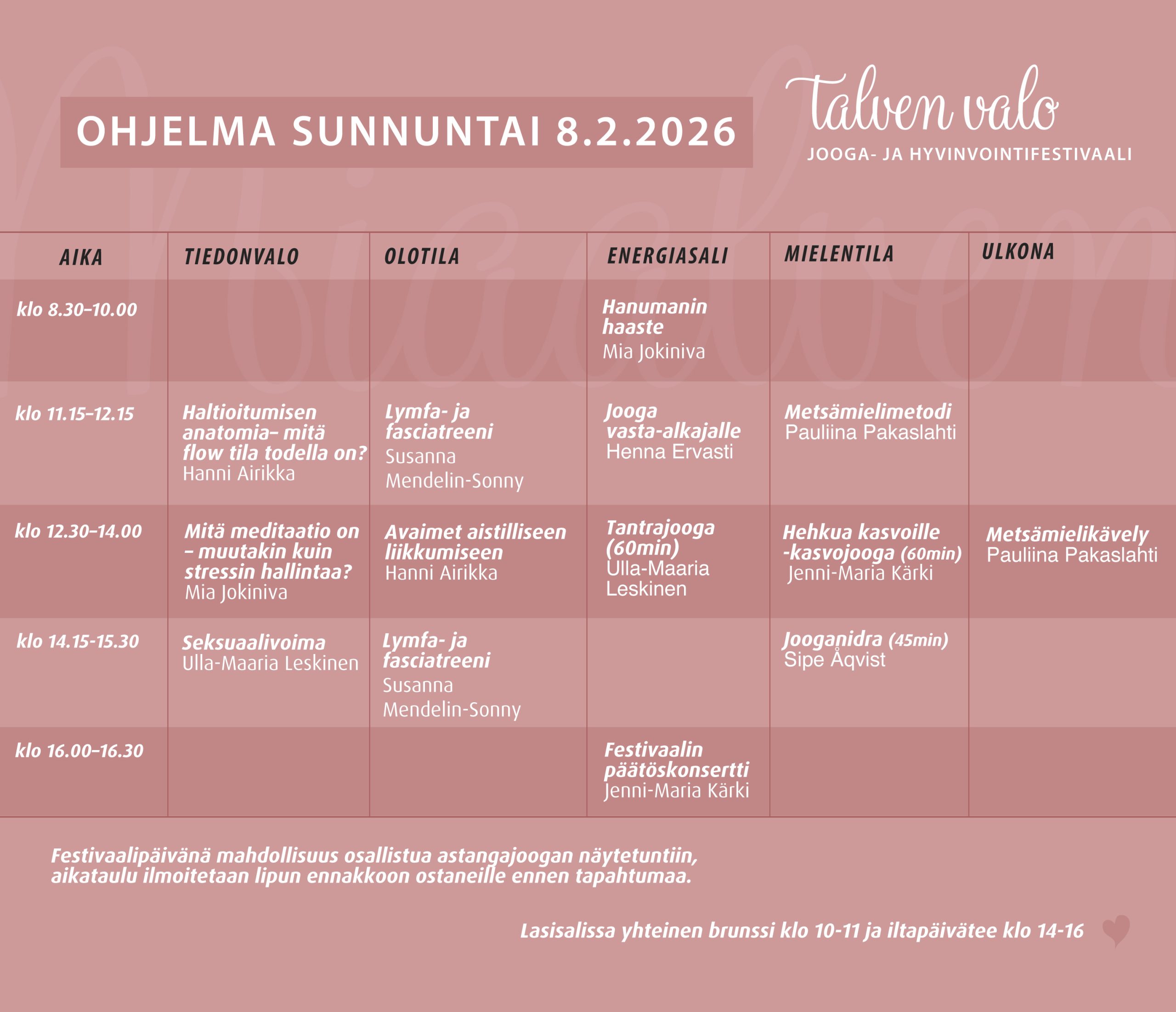 Aamu aloitetaan Mia Jokinivan ohjaamalla dynaaamisella joogaharjoituksella, jonka jälkeen nautimme ravitsevan brunssin. Brunssin jälkeen Tiedonvalon puheenvuorot alkavat Hanni Airikan kiinnostavalla Haltioitumisen anatomia – mitä flow tila todella on? -puheenvuorolla ja tästä päivä starttaa mukavasti kohti muita puheenvuoroja ja mielenkiintoisia tunteja ja workshopeja.